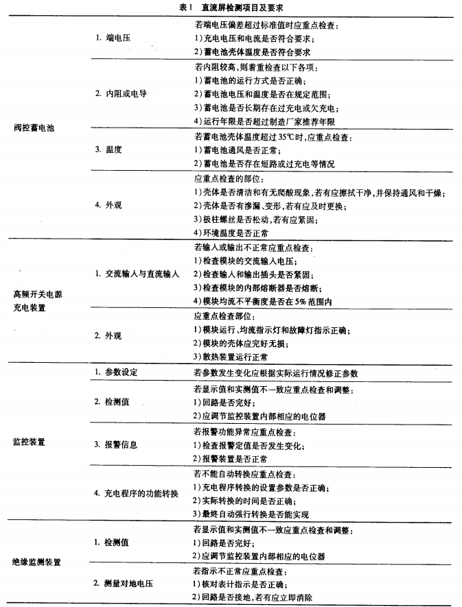 在建立完善的點檢制度之前,首要必須制定契合現(xiàn)場要求,并可以作為依據(jù)的設備檢修標準。在直流屏標準中規(guī)則了直流電源體系設備檢修的基本要求,檢修前的準備、檢測項目、充放電試驗等內(nèi)容。直流屏主要由蓄電池.高頻開關電源充電設備,監(jiān)控設備、絕緣監(jiān)測設備4部分組成,見表1。