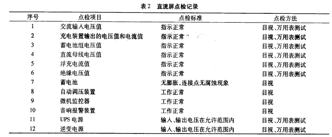 首要需求編制點檢規(guī)范,編制出符合實際出產(chǎn)需求的點檢規(guī)范,使其他點檢者能快速、簡潔執(zhí)行點檢規(guī)范。點檢規(guī)范的內(nèi)容觸及方面比較多,列入點檢辦理規(guī)模的部位也比較多,例如直流屏,溝通輸入電壓值、充電裝置輸出的電壓值和電流值、蓄電池組電壓值、直流母線電壓值、浮充電流值、絕緣電壓值、蓄電池、自動調(diào)壓裝置、微機監(jiān)控器、音響報警裝置、UPS電源、逆變電源等都是關系到直流屏安全運轉(zhuǎn)的重要參數(shù)及裝置,確定為點檢部位。點檢部位確定后,就要落實點檢內(nèi)容,點檢辦法目前還是以簡單東西、儀器和人的感觀為主的點檢辦法。因而,點檢內(nèi)容首要是查看設備溫度、電壓、表計指示、工作狀況等方面參數(shù)。直流屏設備點檢工作首要是以日常點檢為主,定時點檢為輔。日常點檢首要以人的感官為主,經(jīng)過聽、摸、看.擰等辦法對運轉(zhuǎn)中的設備進行一個外觀的查看。經(jīng)過每日進行的點檢工作,及時發(fā)現(xiàn)設備存在的危險并消除,使設備長周期安全運轉(zhuǎn)。由于直流屏的特殊性,展開的直流屏設備專業(yè)點檢也很重要,點檢辦法以工用具、外表和人的感觀為主的點檢辦法。經(jīng)過定時進行的點檢工作,及時發(fā)現(xiàn)設備存在的危險并消除,使設備長周期安全運轉(zhuǎn),見表2。