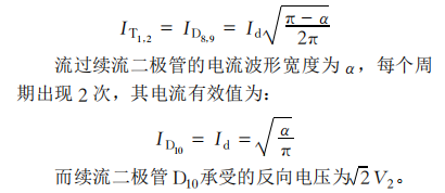 加了續(xù)流二極管后其輸出電壓波形V3與不加續(xù)流二極管時相同。原先流經(jīng)橋臂上元件的續(xù)流電流變成通過二極管續(xù)流。各原件中流過的電流波形和變壓器副邊電流波形明顯有一定的間隔。每個周期中流過晶閘管T1、T2、D8、D9的電流波形寬度都是π—α,其電流有效值為(Id為負(fù)載電流)