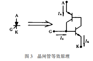 晶閘管的結(jié)構(gòu)相當(dāng)于串級雙晶體管模型P一N一P一N4層結(jié)構(gòu),因而具有3個PN結(jié),分別引出陽極A,陰極K,門極G。在圖3結(jié)構(gòu)里無論在PNP和NPN晶體管的A一K端點施加正向電壓還是反向電壓,其中的P一N一P一N結(jié)構(gòu)都處于高阻阻斷狀態(tài),只通過很小正向漏電流或很小的反向漏電流,與一般二極管的反向特性相似。一旦門極電流Ic注入G點,就會由于形成強(qiáng)烈的正反饋導(dǎo)致PNP和NPN進(jìn)入完全飽和狀態(tài),即晶閘管飽和導(dǎo)通。