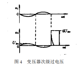 另一方面,直流屏變壓器交流側(cè)也會由于大容量負(fù)載如大變比變壓器的合閘瞬間、其它負(fù)載切斷電源時以及整流變壓器電刀閘的開關(guān)斷開,也會由于初次級繞組間的分布電容,變壓器的激勵電流的突變在次級產(chǎn)生瞬時過電壓,其尖峰值可達(dá)工作電壓峰值的6倍以上,如圖4所示。