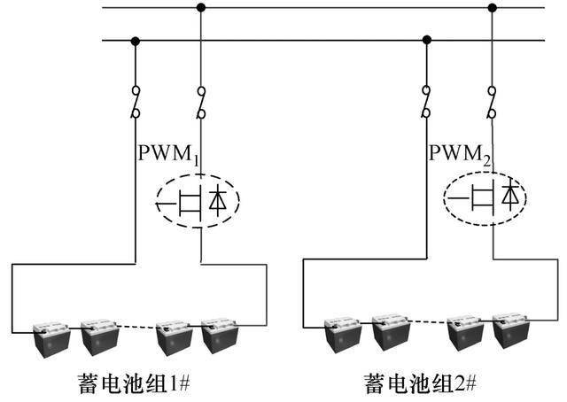 在并聯保護器中的直流屏與蓄電池組之間接入IGBT,經過PWM電路操控充電電壓和充電電流巨細,對充電電流進行約束。兩組蓄電池經過并聯保護器并聯銜接時,其充電通道并聯等效電路如圖3所示。