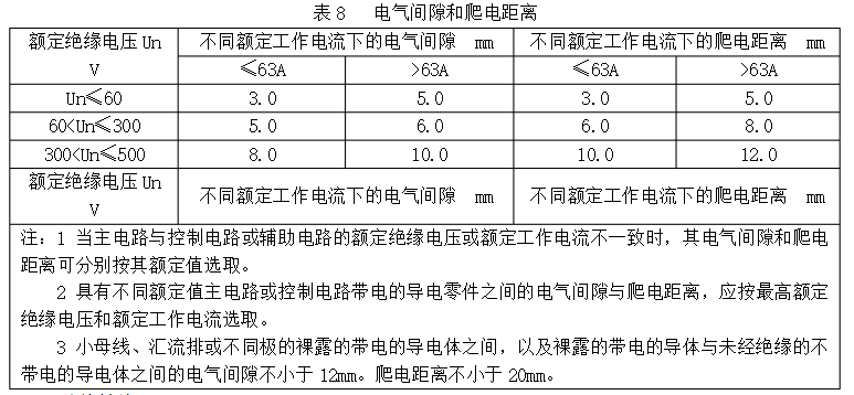 直流屏設備內兩帶電導體之間,以及帶電導體與暴露的不帶電導體之間的最小間隔,均應符合表8規定的最小電氣空隙與爬電間隔的要求。