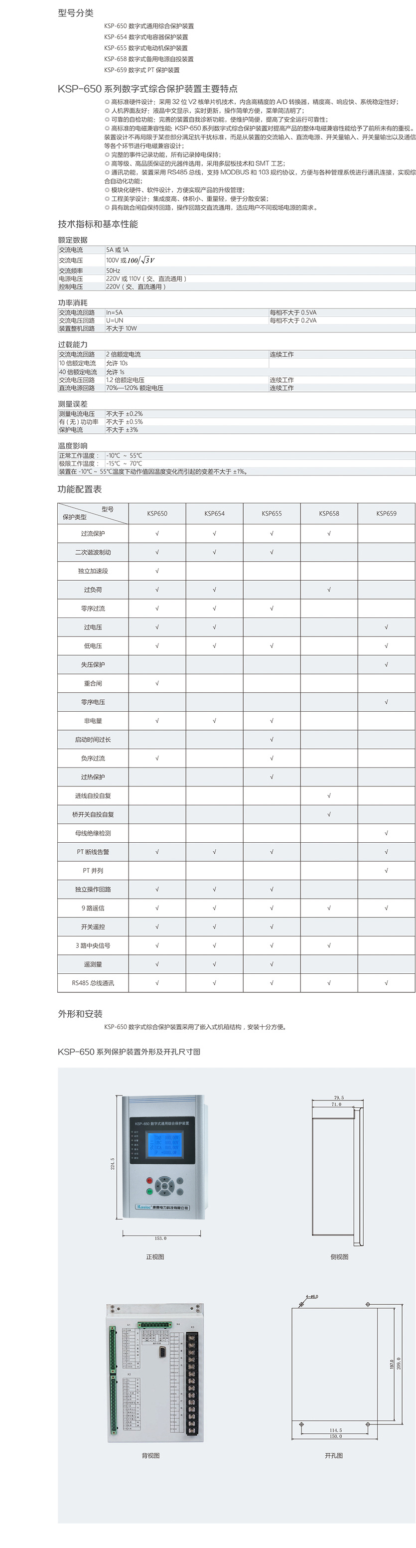 KSP-650 系列數(shù)字式保護裝置,是我公司最新推出的一款實用型綜 合保護裝置。裝置功能齊全,運行穩(wěn)定,采用通用型一體化設(shè)計理 念,具備保護、測量、控制、通訊完備的功能,廣泛適用于 35kV 及 以下電壓等級變配電站、開閉所等場合。新穎的結(jié)構(gòu)設(shè)計,外觀時尚, 結(jié)構(gòu)精巧,既適用于安裝在中置柜內(nèi),也可方便安裝于柜體體積狹 小的環(huán)網(wǎng)柜等各種柜體。